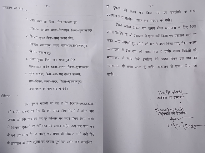 बिहार के मुजफ्फरपुर में अतिक्रमण हटाओ अभियान जोर शोर से चलाया जा रहा है। शहर के अंदर आए दिन जाम की समस्या को देखते हुए प्रशासन ने यह निर्णय लिया था। शहर के अंदर फुटपाथ पर सड़कों के किनारे लगने वाले ठेलो, रेहड़ी-पटरी की दुकानों की भीड़ को प्रशासन ने जाम का प्रमुख कारण माना था और इसी के खिलाफ अतिक्रमण हटाओ अभियान की शुरुआत की थी। जिसके खिलाफ जनसुराज पार्टी अब कोर्ट पहुंची है जहां 19 दिसंबर को CJM (Chief Judicial Magistrate) के समक्ष इसकी पहली सुनवाई होगी।