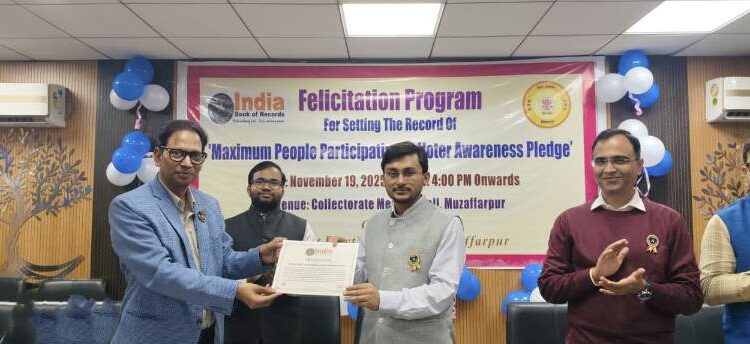 इंडिया बुक ऑफ रिकार्ड में मुजफ्फरपुर शामिल हुआ है। मुजफ्फरपुर में विधान सभा चुनाव को लेकर स्विप अभियान में एक साथ 21 लाख 60 हजार 249 मतदाताओं को शपथ दिलाई गई थी। इस अभियान में जिला बिहार में अव्वल आया और इसी वजह से इस रिकार्ड में इसे शामिल किया गया।